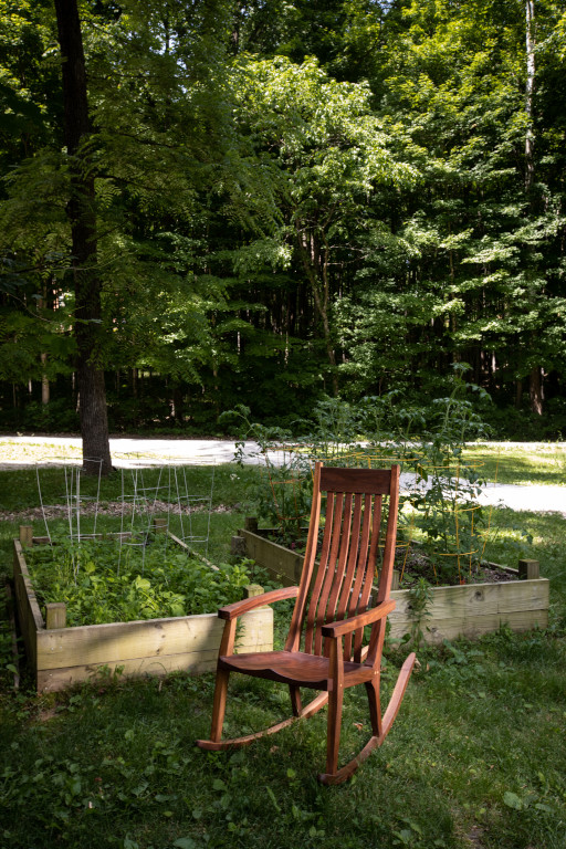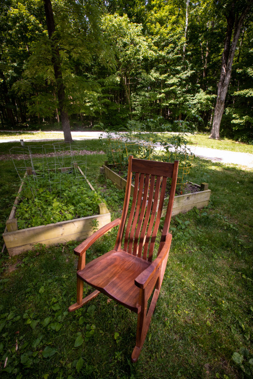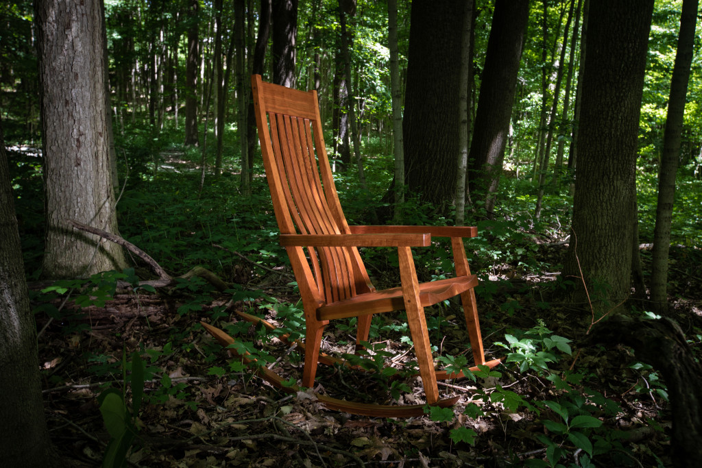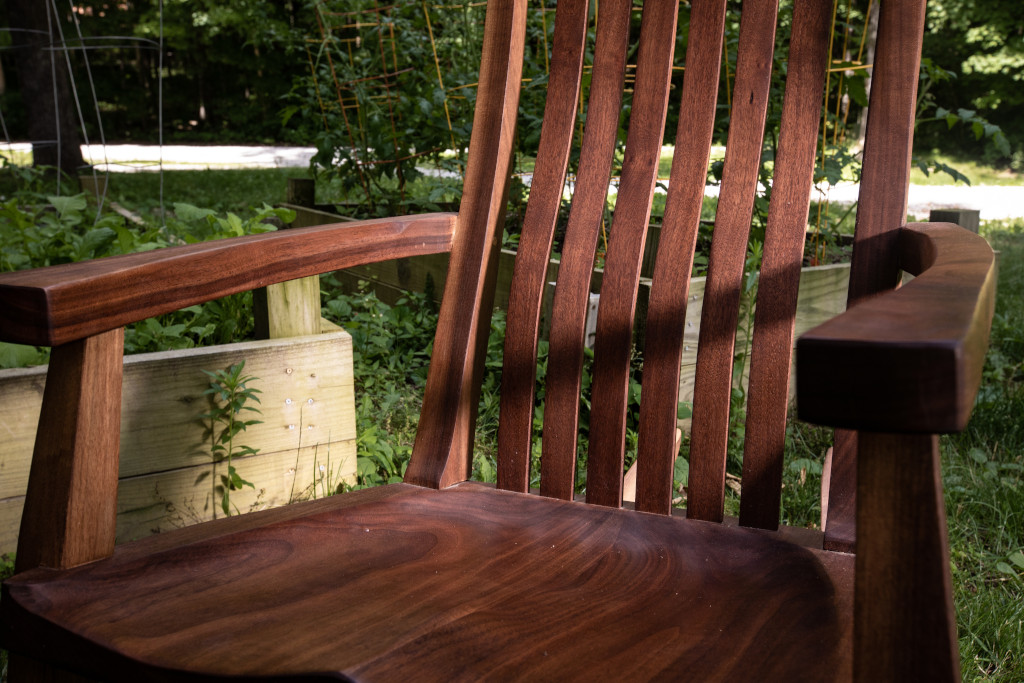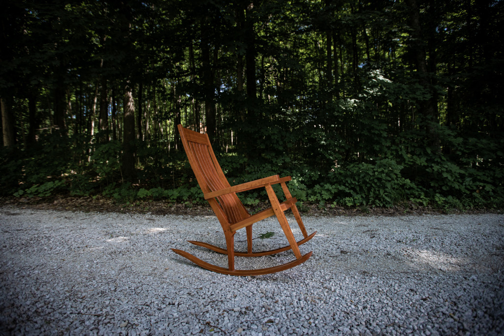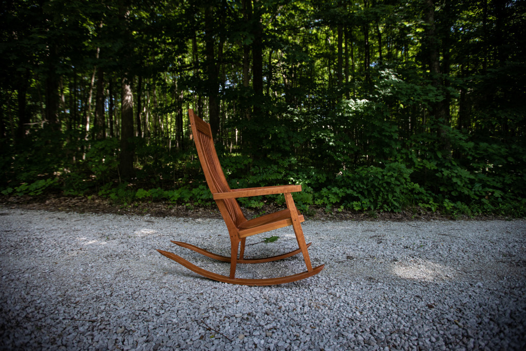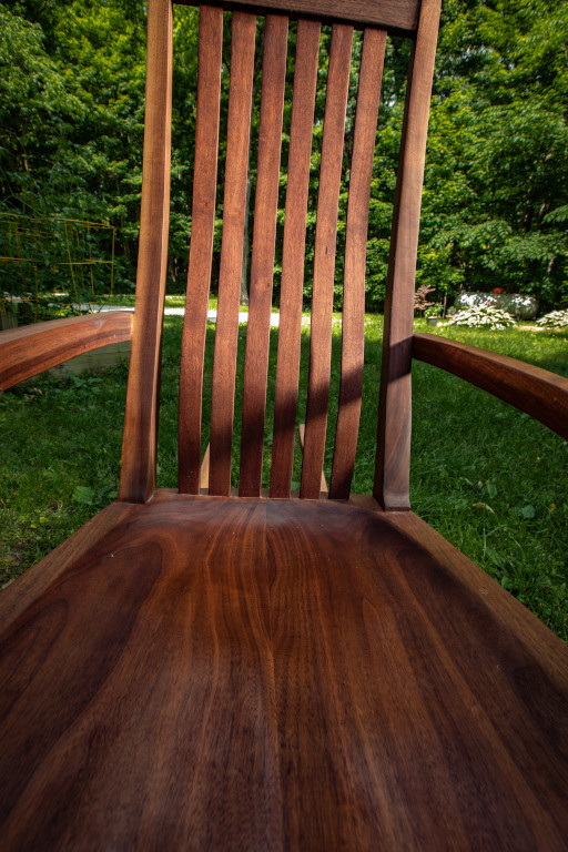 A sculpted cherry rocker in the vein of Sam Maloof and Scott Morrison. The seat is hand sculpted and saddled, leaving an incredibly comfortable experience. The slightly raised armrests lift your elbows as you recline. As a result, your shoulders place no pressure on your chest, making deep breathing and even sleeping much easier. Walnut accents in the joinery and bent-lamination rockers and backrest splats make for eye-catching details. Also available in black walnut (add $300), hard maple, poplar (subtract $100) and select other hardwoods upon request. If customer supplies the height of intended chair user, the headrest can be placed in the ideal position in the backrest at no additional charge.